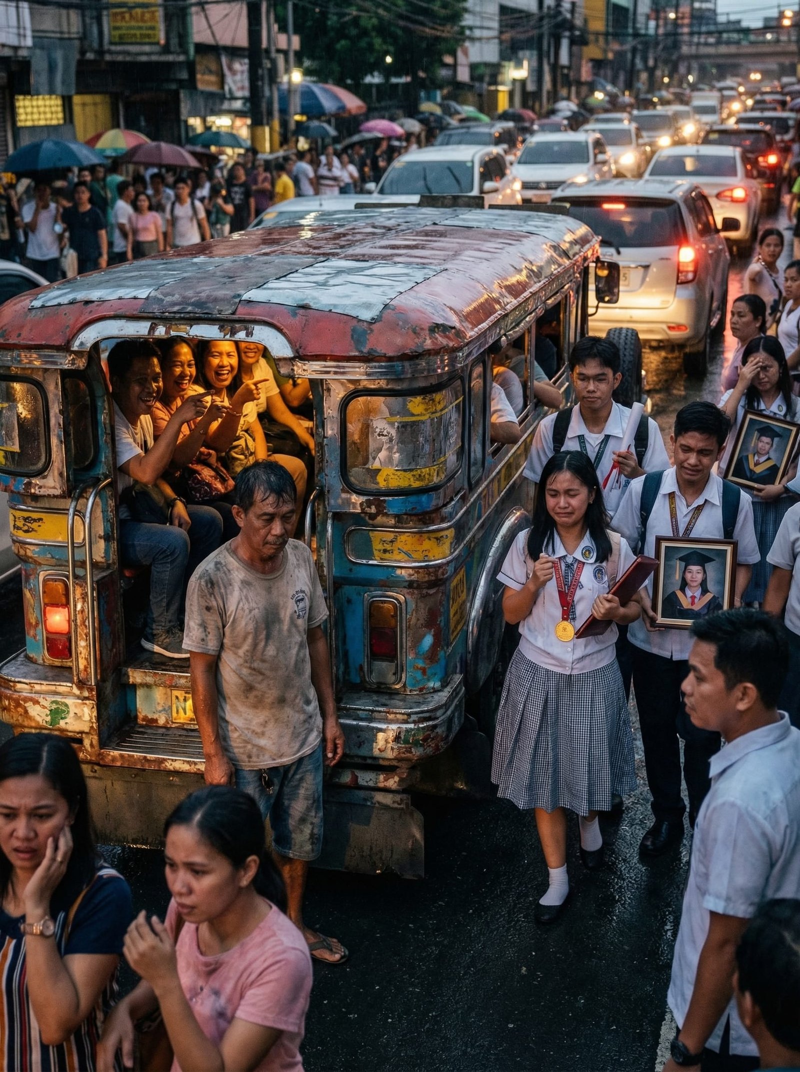 Sa araw na iyon, maulan at mabigat ang trapiko. Puno ng estudyante ang jeep ni Mang Nilo dahil uwian mula sa isang public high school at kolehiyo sa lungsod. May dalawang lalaking pasahero sa likod na walang tigil sa kakatawa habang pinipitik ang kalawang sa gilid ng jeep.