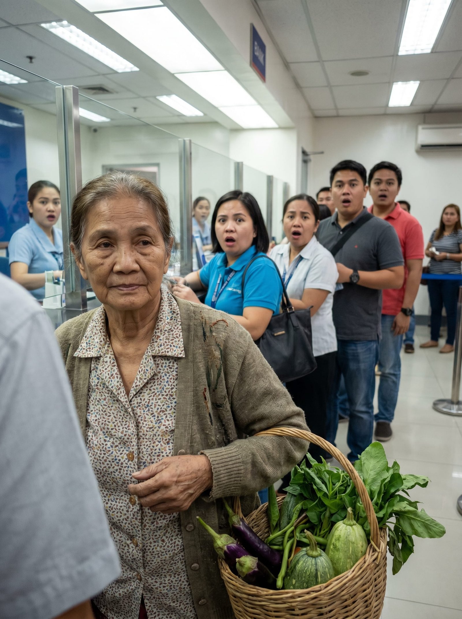 Sa gitna ng mahabang pila, pumasok ang isang matandang babae na may suot na lumang bestida, kupas na cardigan, at simpleng tsinelas. Sa isang kamay ay may hawak siyang lumang pitaka. Sa kabilang braso naman ay nakasabit ang isang basket na may lamang talong, kalabasa, sitaw, at ilang dahon ng gulay na halatang galing pa sa bukid o palengke.