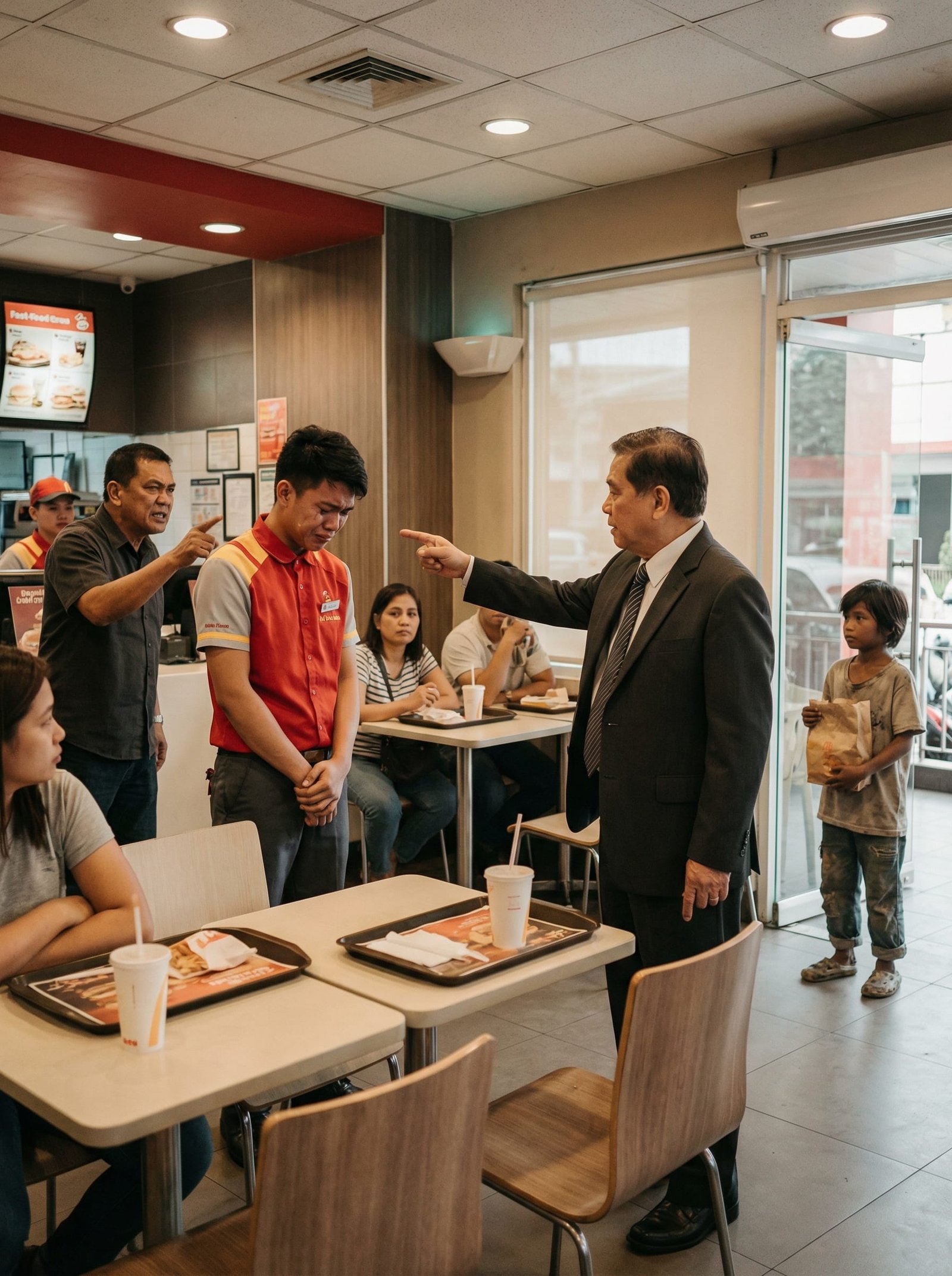Inayos niya ang kanyang coat, pinunasan ang kamay, at dahan-dahang naglakad papunta sa gitna. Hindi siya sumigaw. Hindi rin siya nagmamadali. Ngunit sa simpleng pagtayo pa lang niya, tila biglang nag-iba ang ihip ng hangin sa buong fastfood.