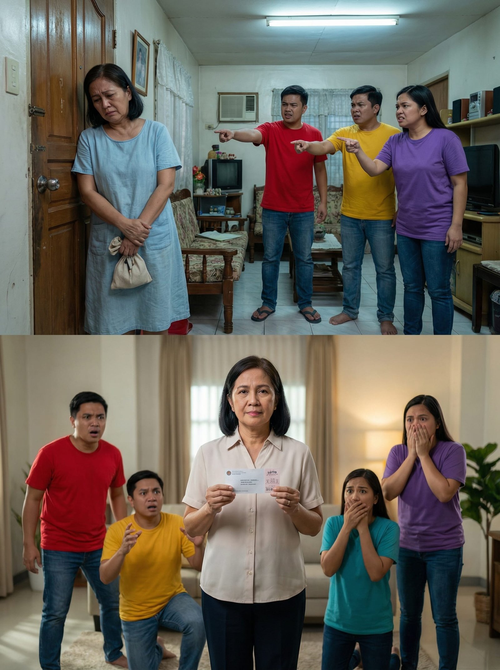 Sa lumang sala na amoy mantika at pagod, nakatayo si Aling Rosa, hawak ang maliit na supot ng damit at ilang barya sa palad. Nakayuko siya, hindi makatingin sa tatlo niyang anak na nakapila sa harap—parang hukom sa sariling bahay.