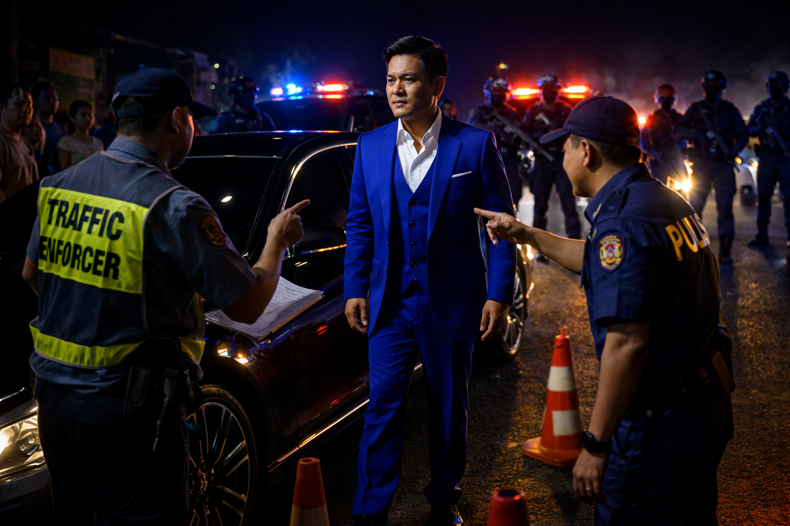 Madilim ang kalsada at tanging ilaw ng pulang-asul na wangwang ang sumasayaw sa basang aspalto. Sa gitna ng checkpoint, may mga cone, flashlight, at mga matang nagmamasid na parang may hinahanap na kasalanan sa bawat dumaraan. Dahan-dahang huminto ang itim na sedan na may makintab na pintura at halatang bago ang gulong. Pero ang pinaka-kapansin-pansin—ang salamin nito, sobrang tinted.