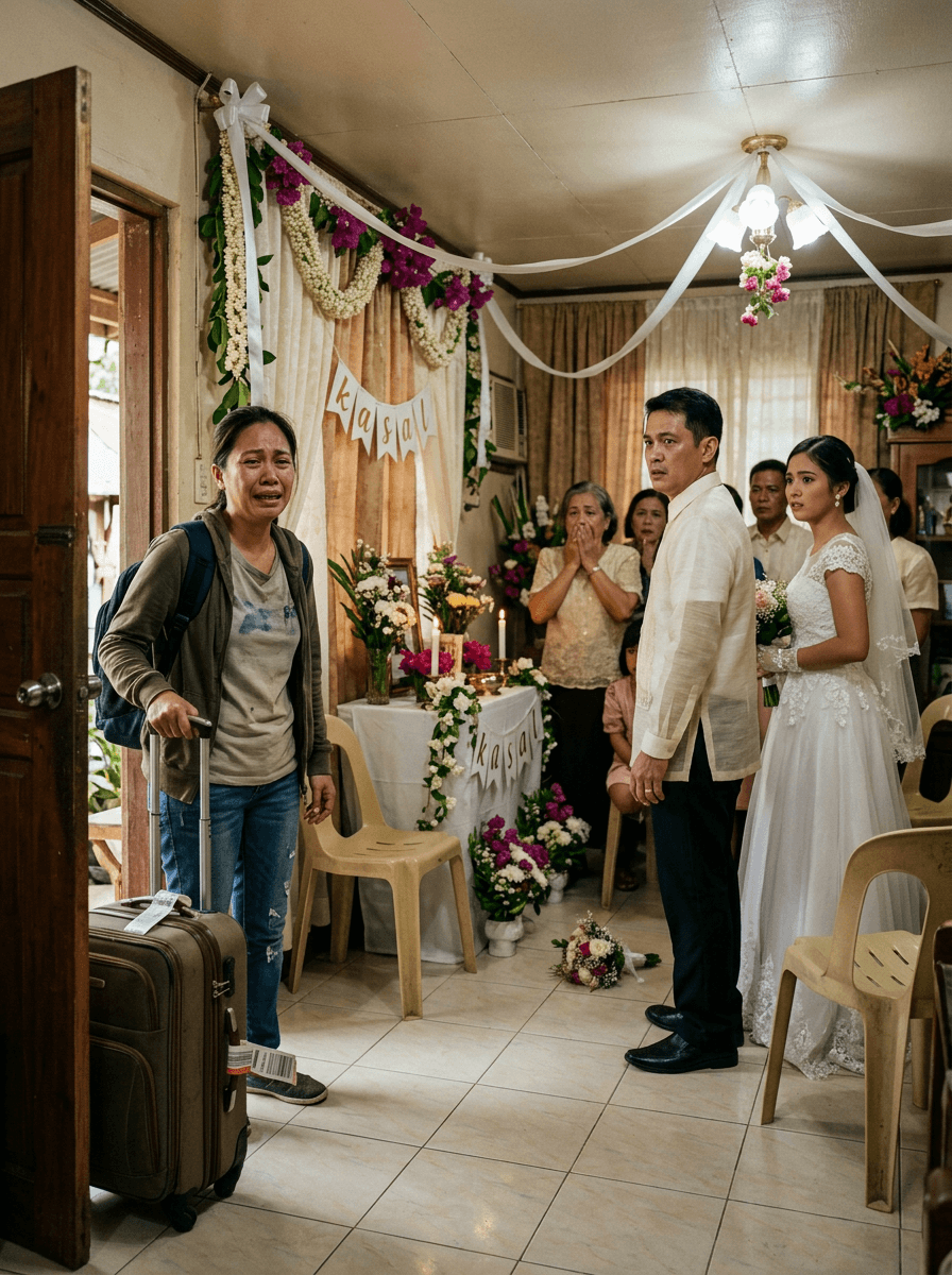 Huminto si Mariel sa bungad ng pinto, tila hindi makahinga. Sa loob ng bahay nila, may simpleng dekorasyon ng kasalan—puting tela, bulaklak, upuang inayos nang maayos, at ilang taong nakabarong at nakadamit-pormal. Sa harap, nakatayo si Ramon.
