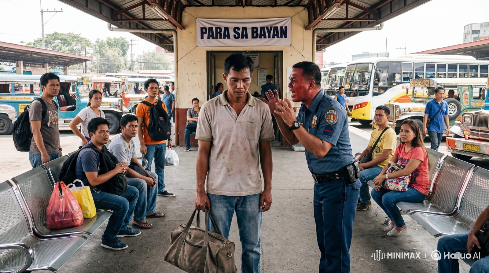 “Hoy! Ikaw!” sigaw ng pulis na naka-assign sa terminal—si PO2 Magsino. Matigas ang mukha, malakas ang boses, at halatang sanay magpahiya.
