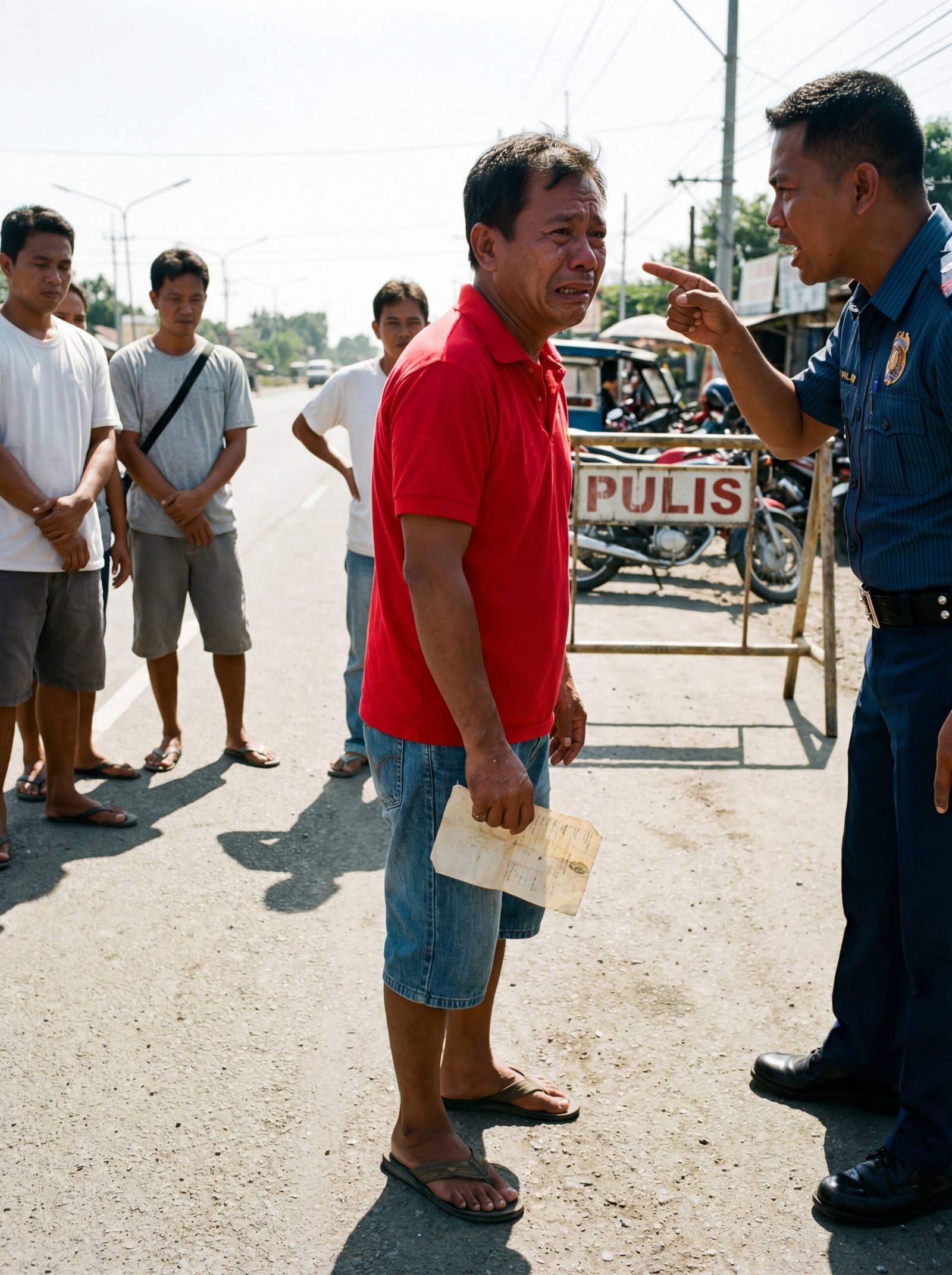 Tanghaling tapat sa kalsadang alikabok, kumikislap ang init sa aspalto. Sa may checkpoint na may karatulang “PULIS”, nagsisiksikan ang mga tricycle at motor. Sa gilid, nakatayo si Rodel, naka-short at tsinelas, hawak ang isang gusot na papel—parang resibo o lumang dokumento. Pawis na pawis siya, nanginginig ang panga, halatang may dinadalang bigat.