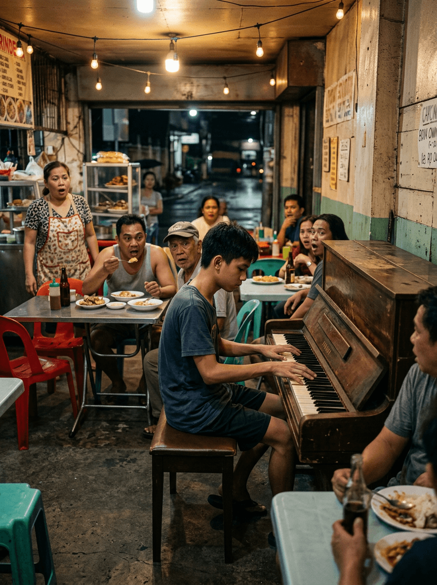 Kinabukasan, kumalat ang video—hindi yung video na nakakatawa, kundi yung video na nakakaiyak: si Noah, tumutugtog sa lumang piano sa karinderya, habang ang mga tao’y tahimik, at may caption: “PRODIGY SA PIANO, NAKIKIUSAP KAPALIT NG PAGKAIN.”