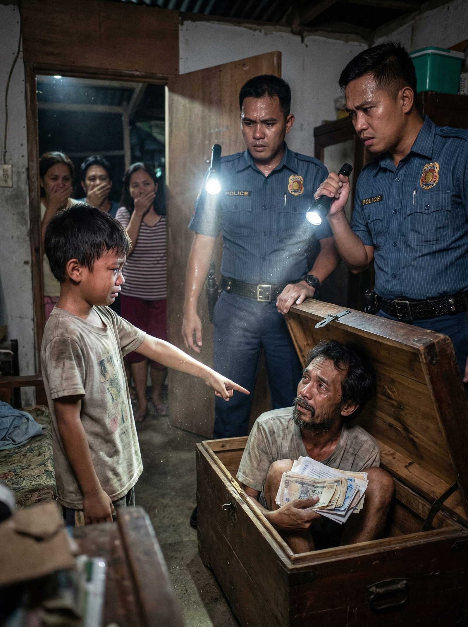 Ang baul ay luma, kupas, at may kalawang na kandado ngunit bahagyang nakabukas ang takip. Biglang natahimik ang buong bahay. Pati ang mga kapitbahay sa may pinto ay napahinto sa bulungan. Hindi makapaniwala ang isang pulis sa narinig. Hindi niya alam kung biro iyon ng bata, guni-guni, o isang desperate na pagtatago.