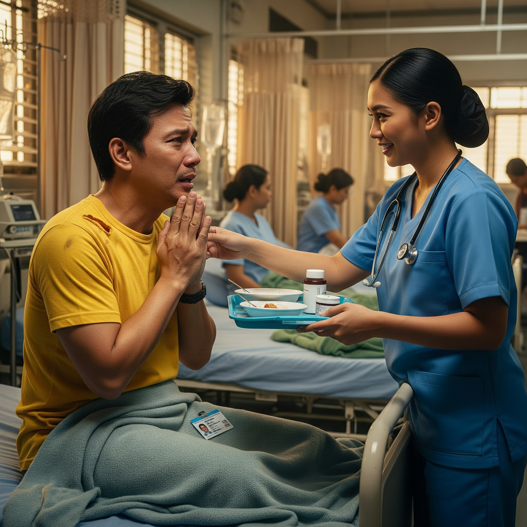 “Magandang umaga po, Mr. Cruz,” bungad ng isang boses na may ngiti. Paglingon niya, nakita niya si Nurse Lea, nakasuot ng scrubs na kulay asul, may stethoscope sa leeg at tray ng gamot sa kamay. “Ako po si Nurse Lea, assigned sa inyo at sa mga pasyente sa row na ‘to. Kamusta po pakiramdam ninyo?”
