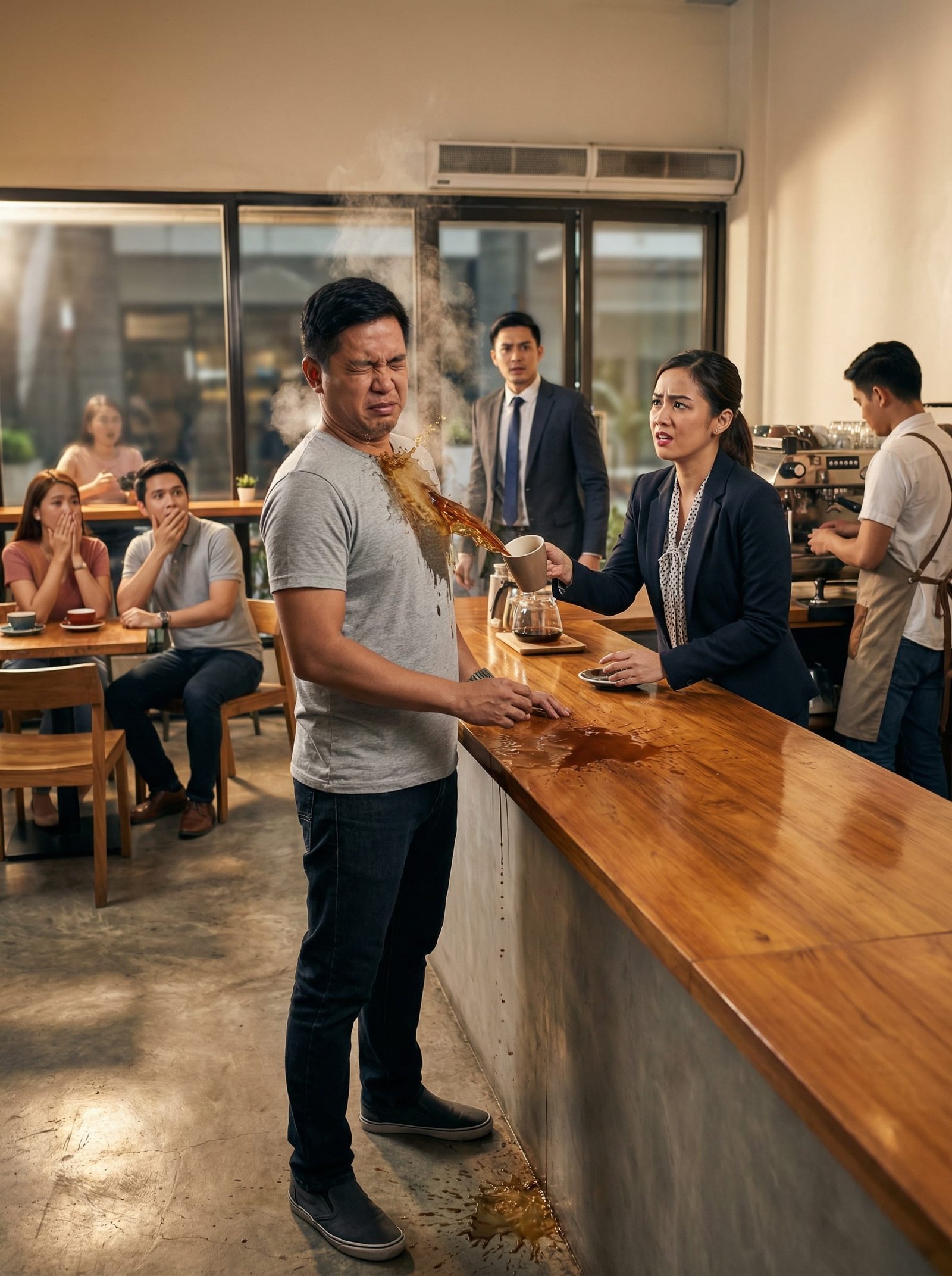 Parang lalong nainsulto si Vanessa. Sa isip niya, sino ba ang lalaking ito para kwestiyunin siya sa sarili niyang branch? Sa sobrang yabang at inis, hinawakan niya ang tasa ng bagong timplang mainit na kape na dapat sana’y ihahain sa ibang customer. Sa galit ng kanyang galaw, nasagi niya ang hawak ni Adrian at bumuhos ang umaasong kape sa dibdib at balikat ng lalaki.