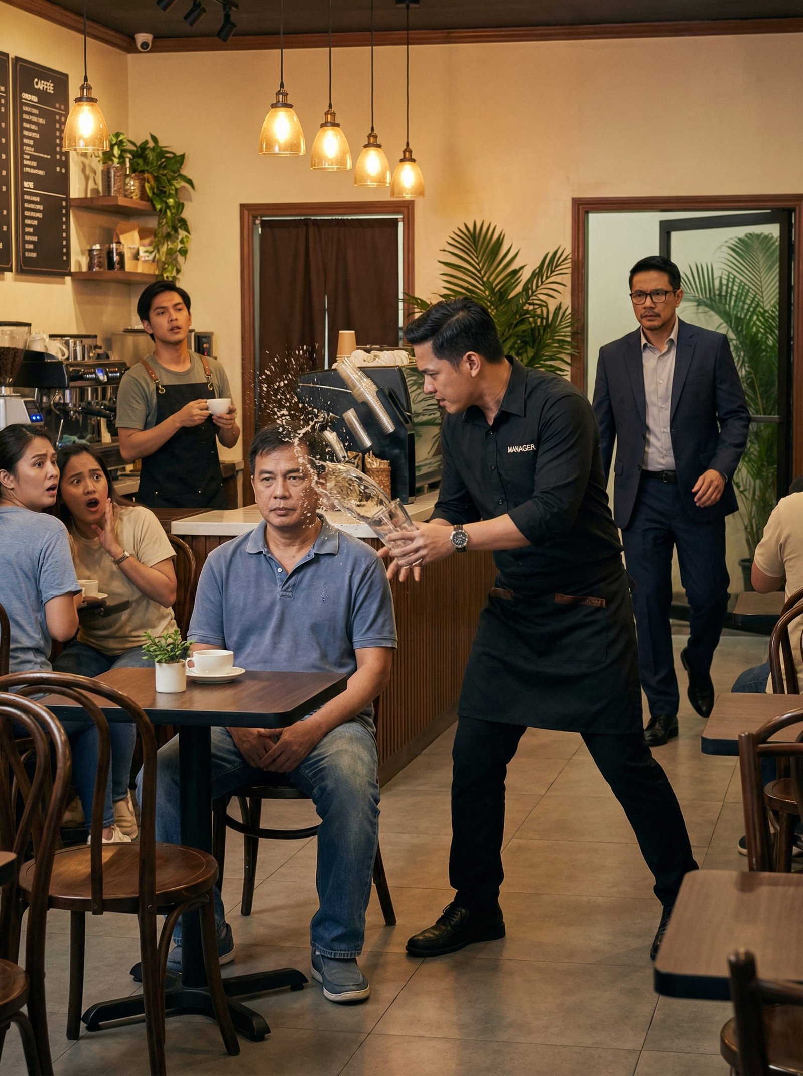 Ngunit sa mismong sandaling iyon, may isang batang waiter na nagkamaling makasagi sa tray ng tubig sa gilid ni Marco. Sa tindi ng inis ng manager, bigla niyang kinuha ang isang basong tubig at, sa harap ng lahat, ibinuhos iyon sa ulo at mukha ni Adrian.
