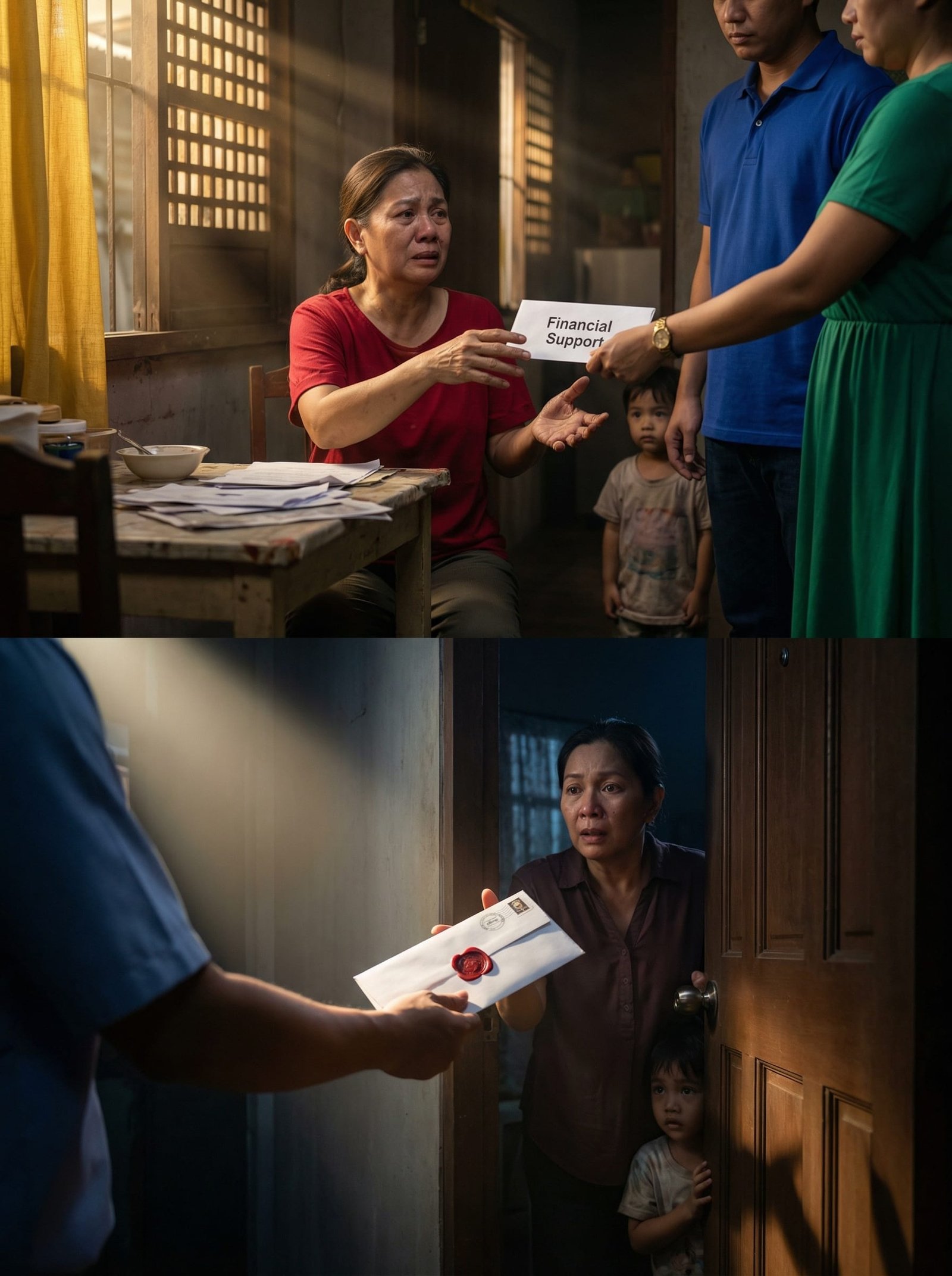 Sa harap niya, nakatayo ang anak niyang si Rico, nakapolo at tahimik, at ang asawa nitong si Maris—nakapustura, malamig ang tingin, at hawak ang isang sobre na malinaw ang nakasulat: FINANCIAL SUPPORT.