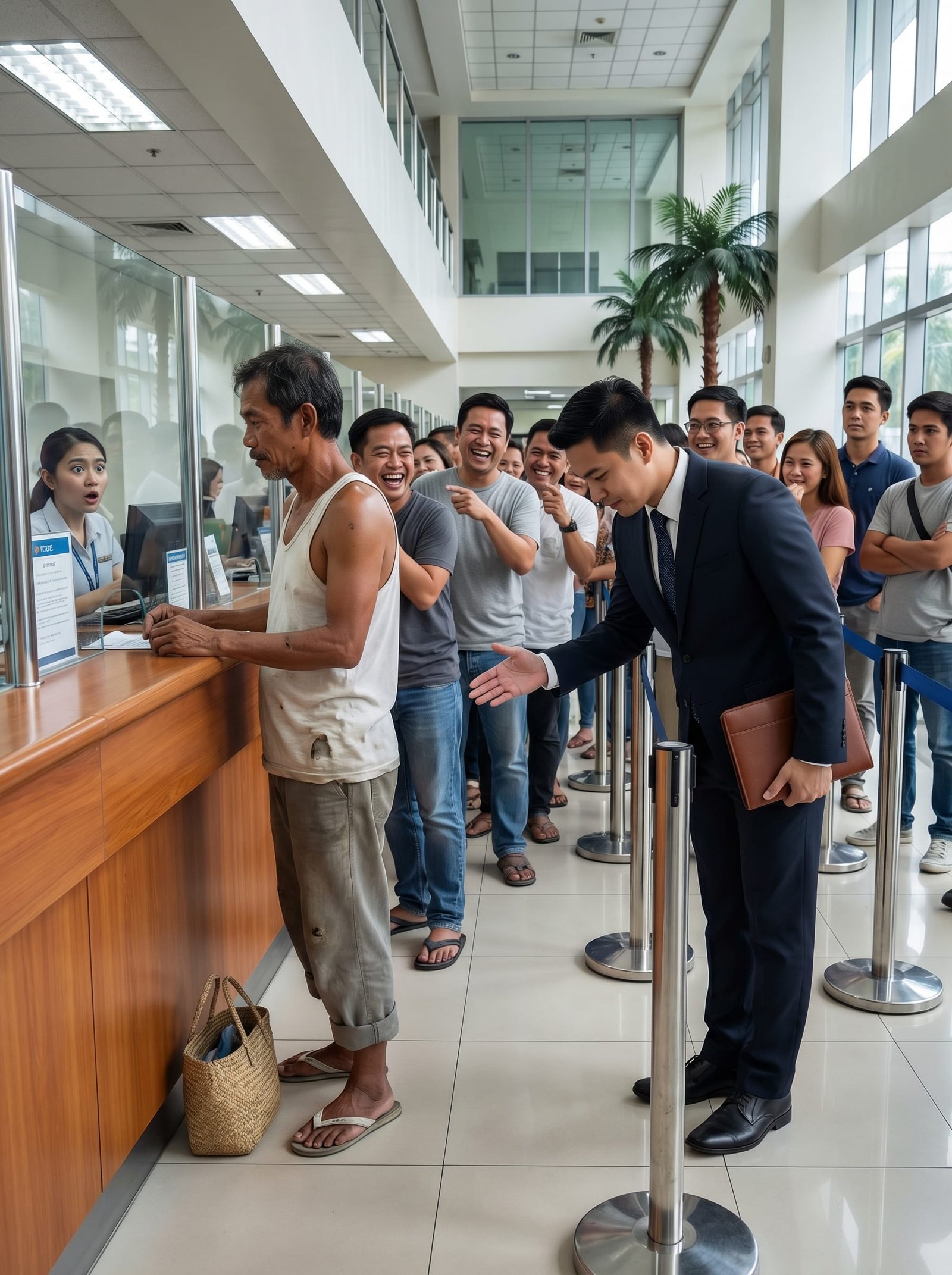 Mahaba ang pila sa bangko nang araw na iyon. Nakaayos ang karamihan—may mga naka-polo, may mga may dalang leather folder, may mga negosyanteng halatang sanay sa malamig na aircon at tahimik na galaw ng mga teller. Sa gitna ng mga pormal na bihis, may isang lalaking payat, nakasuot lang ng lumang sando, kupas na pantalon, at tsinelas na halos mapudpod na ang talampakan.