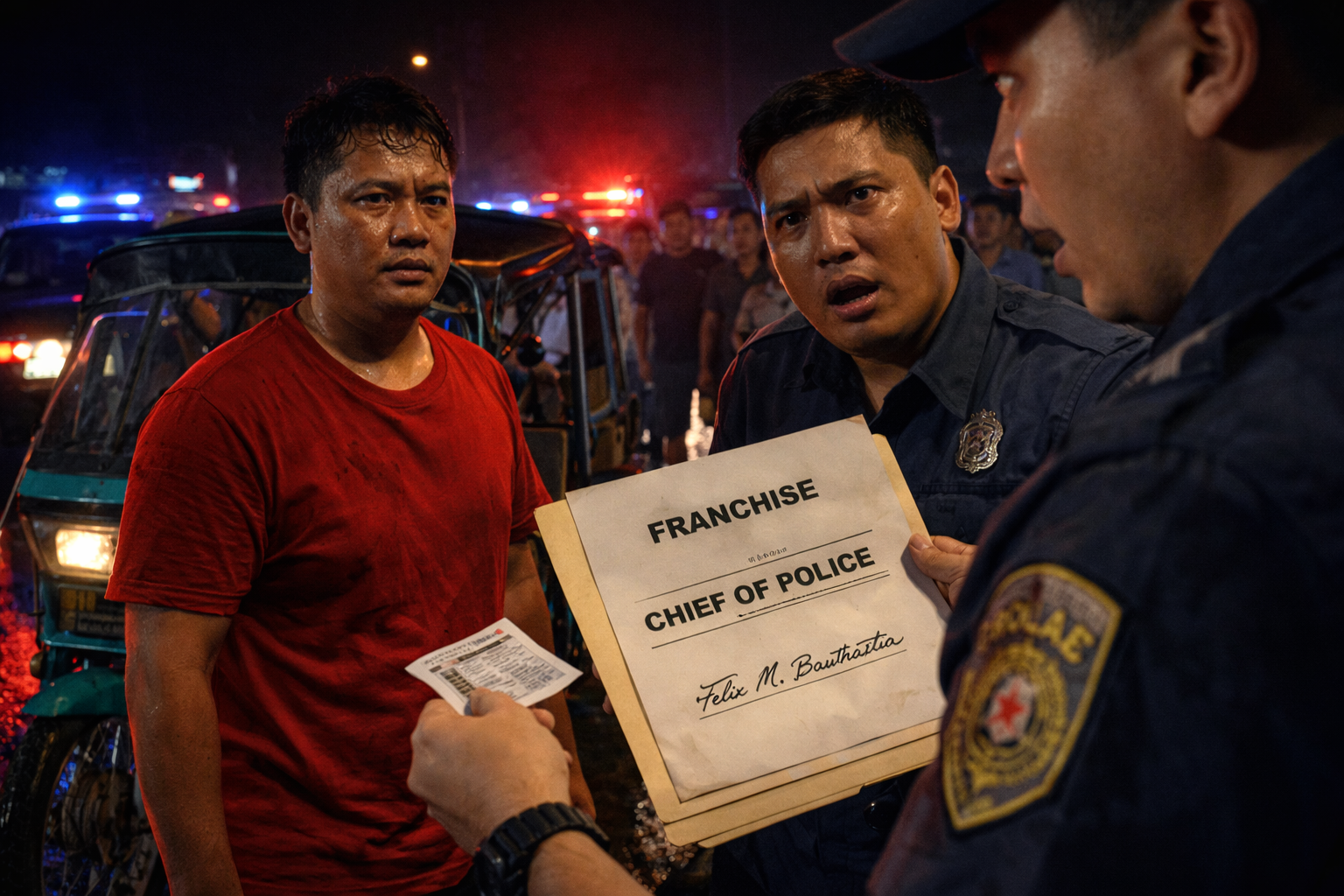 “Station, verify ko lang. May tricycle driver dito, Mang Ben daw. May prangkisa na may lagda ni… Chief Felix Bautista. Legit ba ’to?” sabi niya, halatang may halong pang-aalipusta.