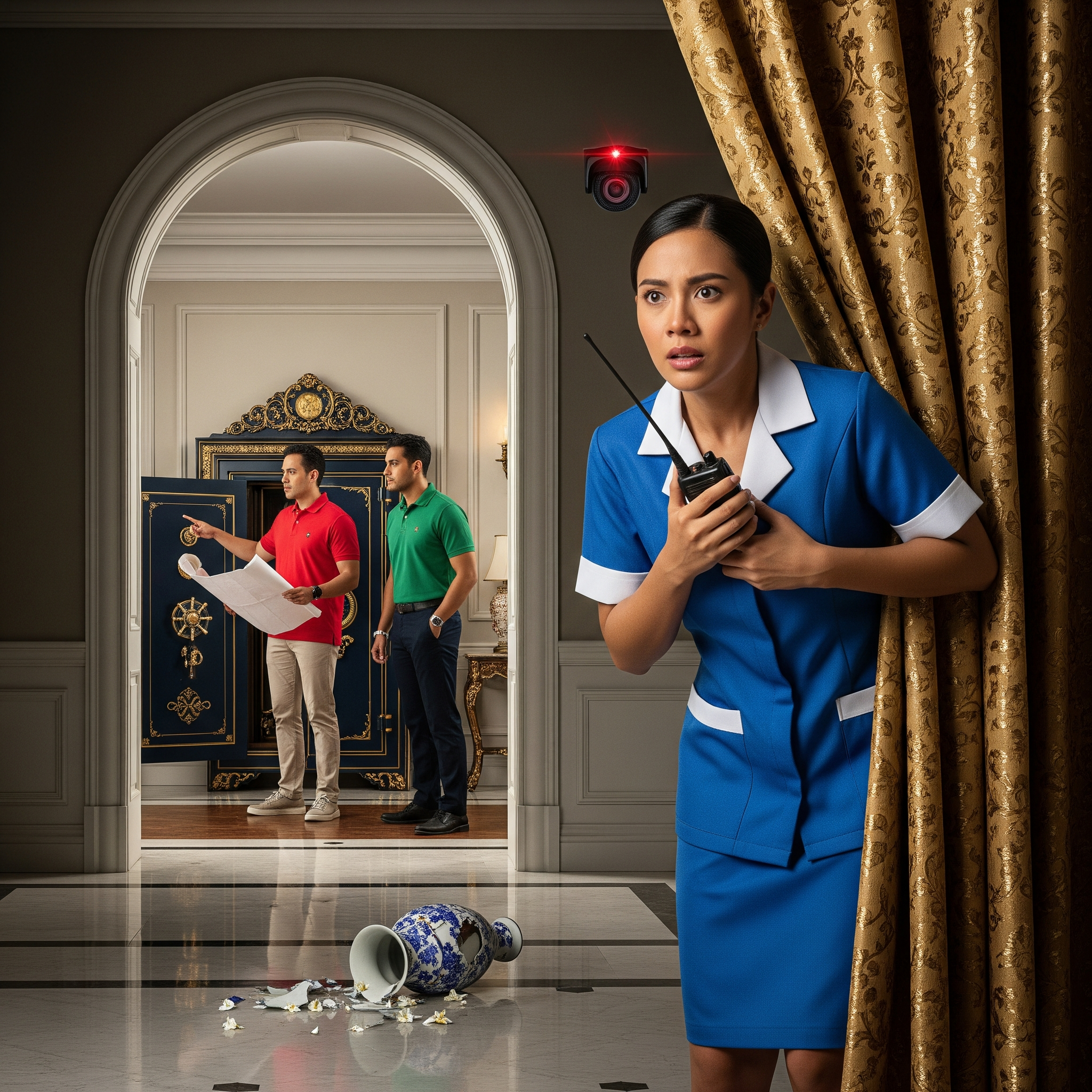 Sumilip nang bahagya si Mia sa pagitan ng mabibigat na kurtina. Nakita niya ang dalawang lalaking hindi niya kilala bilang regular na bisita. Ang isa naka-pulang polo, may hawak na blueprint; ang isa naka-berdeng polo, nakatayo sa harap ng napakalaking asul at gintong vault na parang pintuan ng bangko. May nakabulsa sa likod nila na parang mga gamit pang-eksperto—hindi pang-ordinaryong manggagawa.