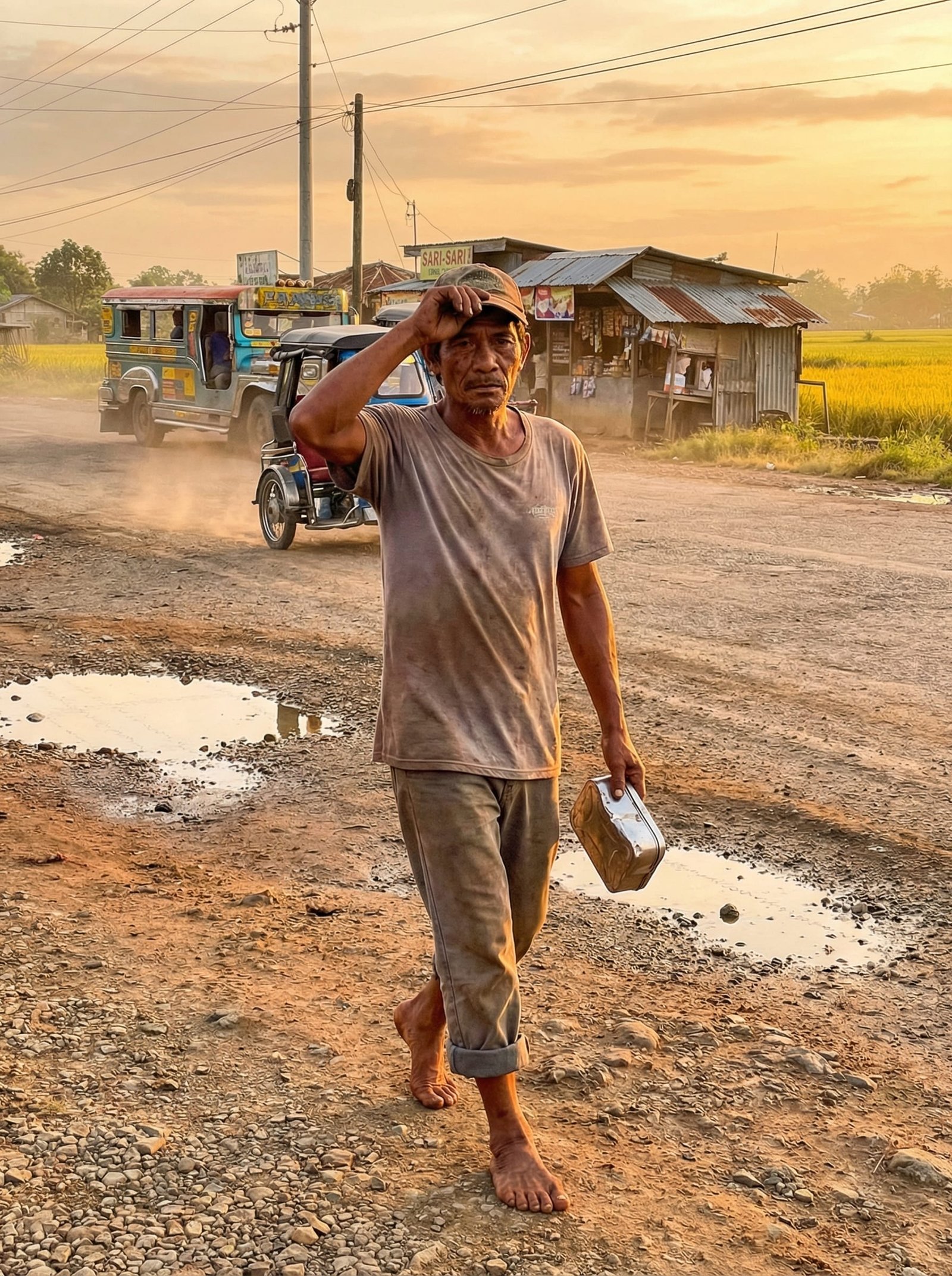 Sampung kilometro ang nilalakad niya araw-araw papunta sa pabrika sa bayan. Hindi siya sumasakay ng traysikel, hindi rin nagje-jeep kahit may dumaraan. Kapag tinatanong siya ng mga kapitbahay kung bakit hindi man lang siya bumili ng tsinelas, tumatawa lang siya at sinasabing, “Mas gusto kong maramdaman ang lupa habang may lakas pa akong maglakad.”